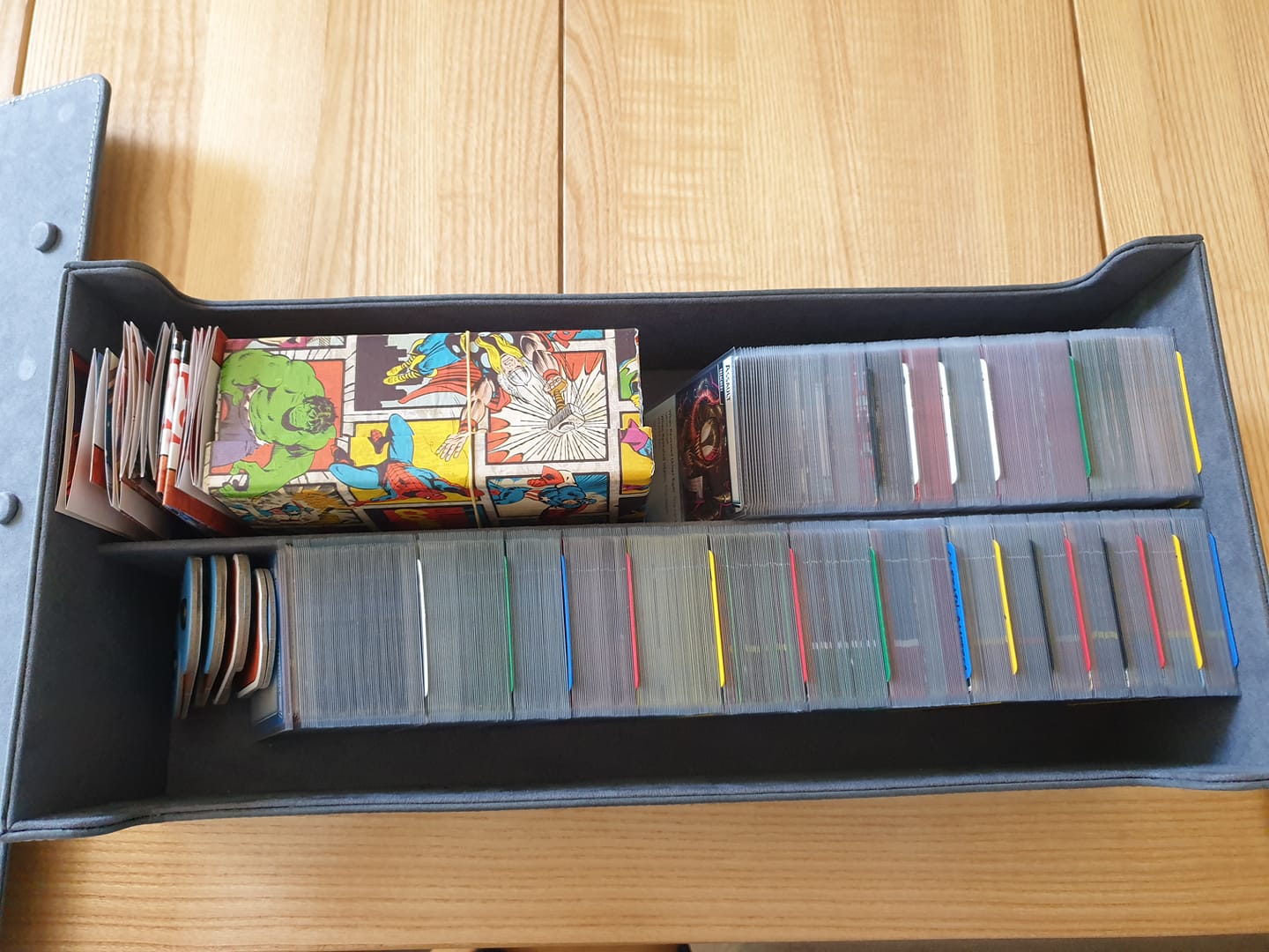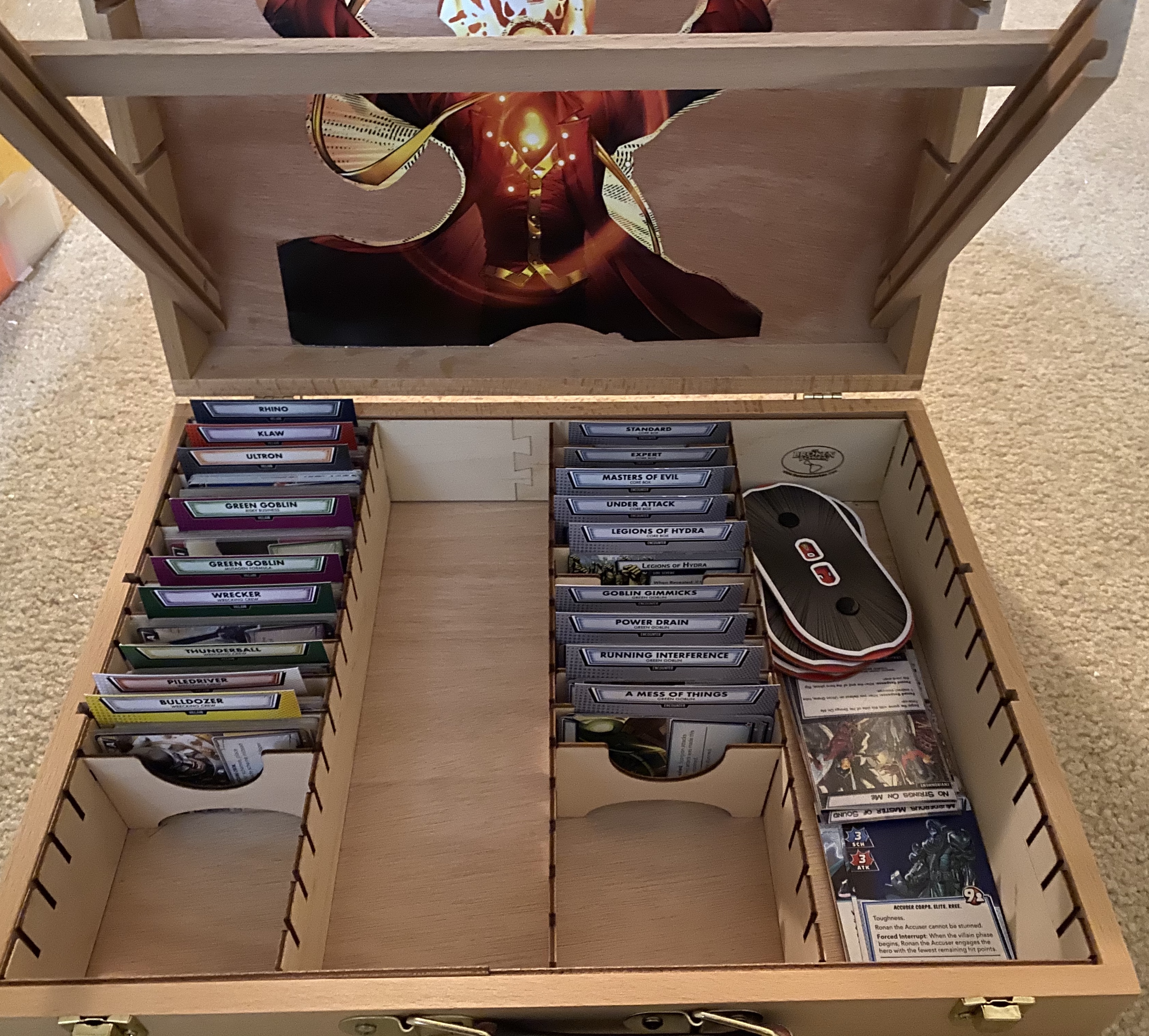 The second image shows what Marvel Champions LCG looks like with all of the scenarios and mods stored through August 2020 in the Artist’s Case. The dividers are from Tesseract Games.