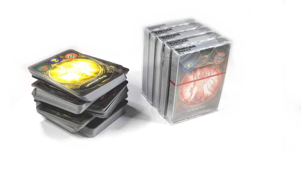 Hero cards are stored inside of Ultra Pro “Mini Snap” card holders for extra effect. It adds a cool little weight to slamming the card down on either side when you’re flipping between alter-ego and hero form.