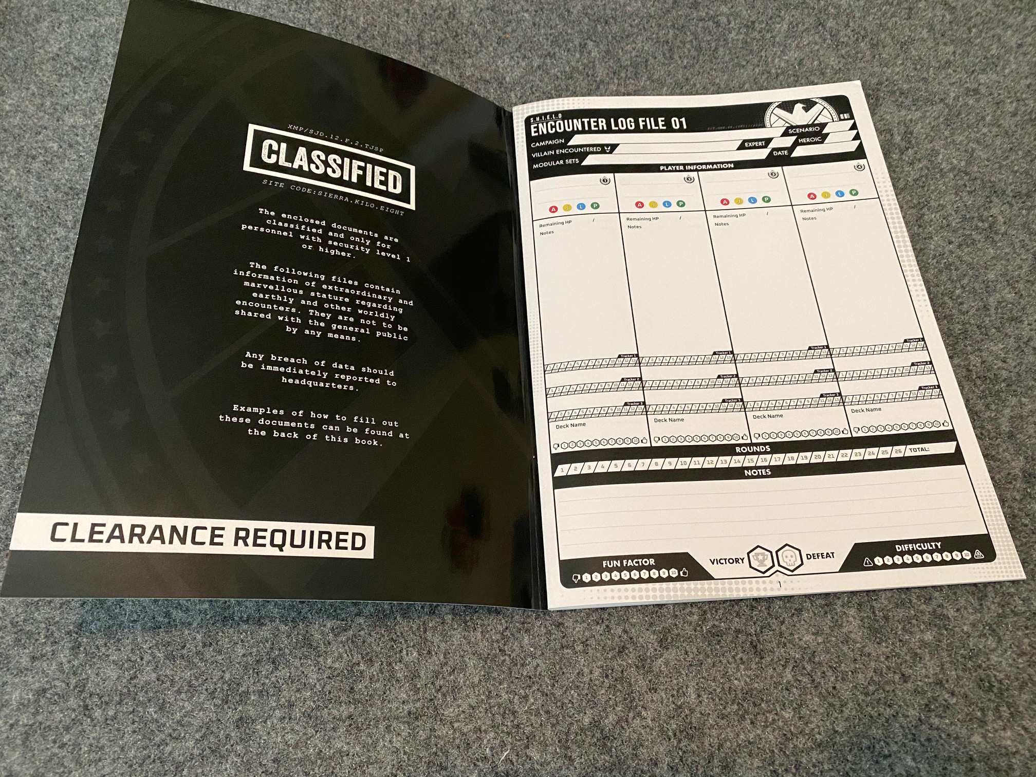 Having gotten our hands on it, the book itself is fantastic. The front logo is very pronounced, and opening up a “S.H.I.E.L.D.” file should add a bit of thematic flair to your game.