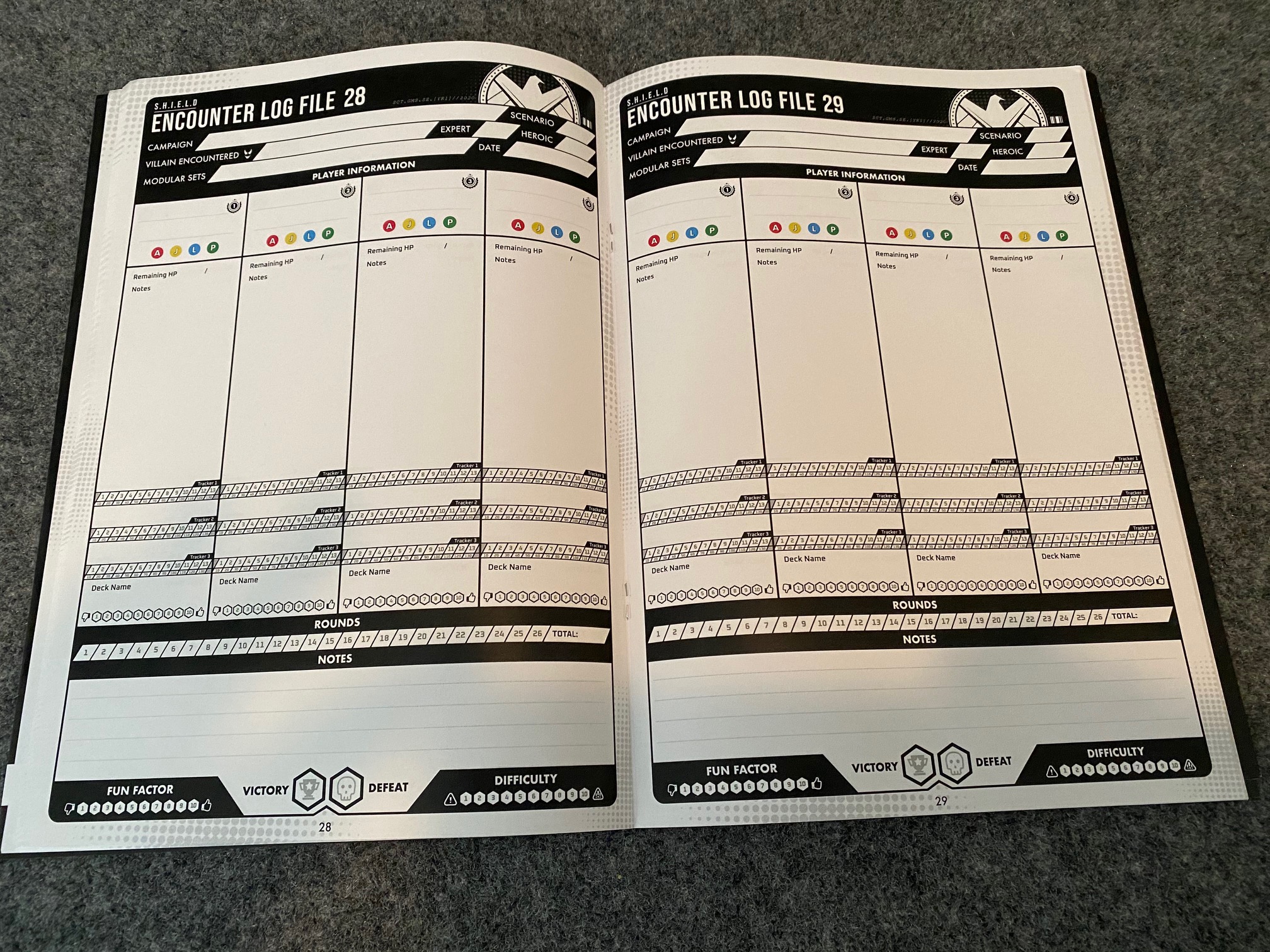 The idea is that you use one page for an entire campaign, recording your player names, hero identities, and notes that are relevant to your playthrough (like how many delay counters were left on Absorbing Man, and so on). There’s also extra “scoring” sections, for defeated minions, side schemes removed, the last round, and the highest damage dealt in a turn.