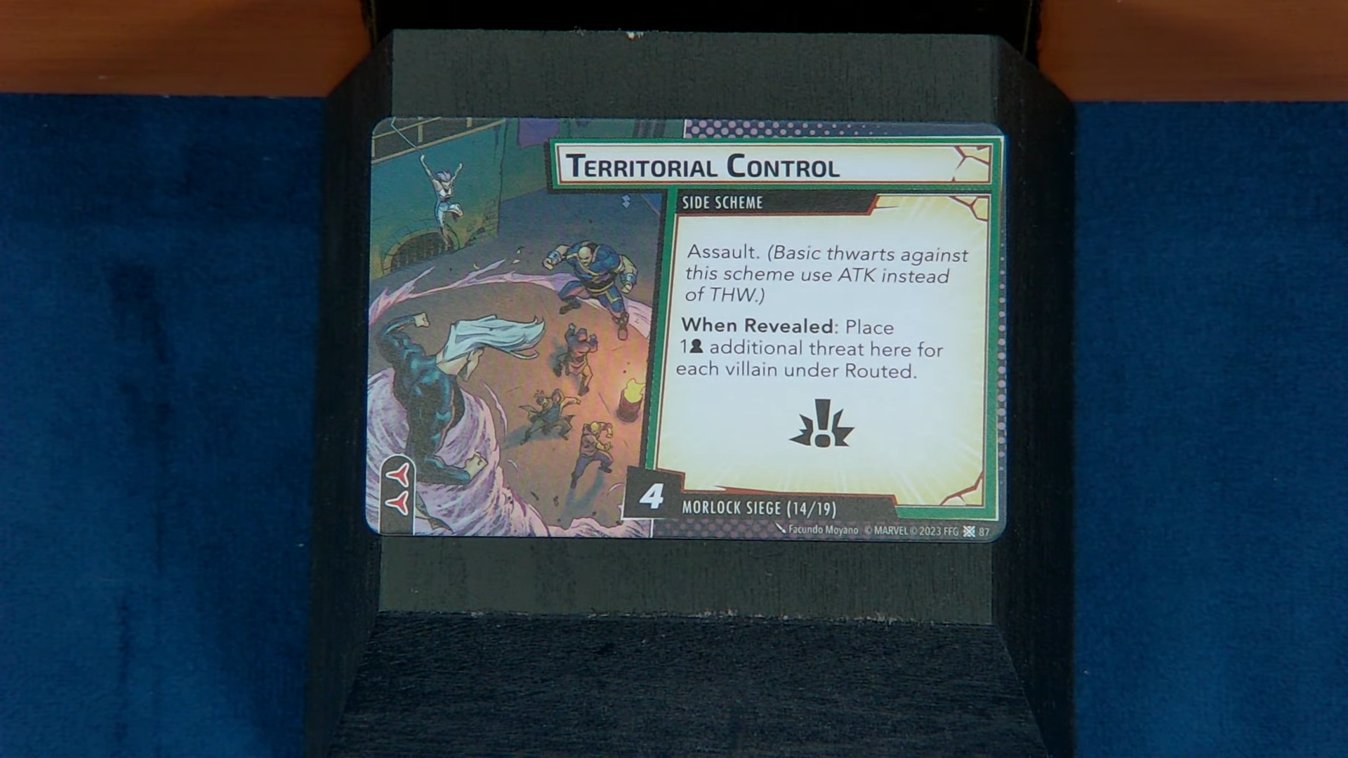 Tony: “This is the first Marvel Champions box I got to work on as part of the Champions line. Player side schemes are a brand new type of card introduced in this expansion…all but one of them have a per-player amount [of threat] and a per-player reward…so it’s like a team effort. There’s a restriction…in a 1-2 player game there’s only one in play at a time, and in 3-4 player there’s two.”
