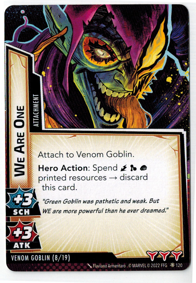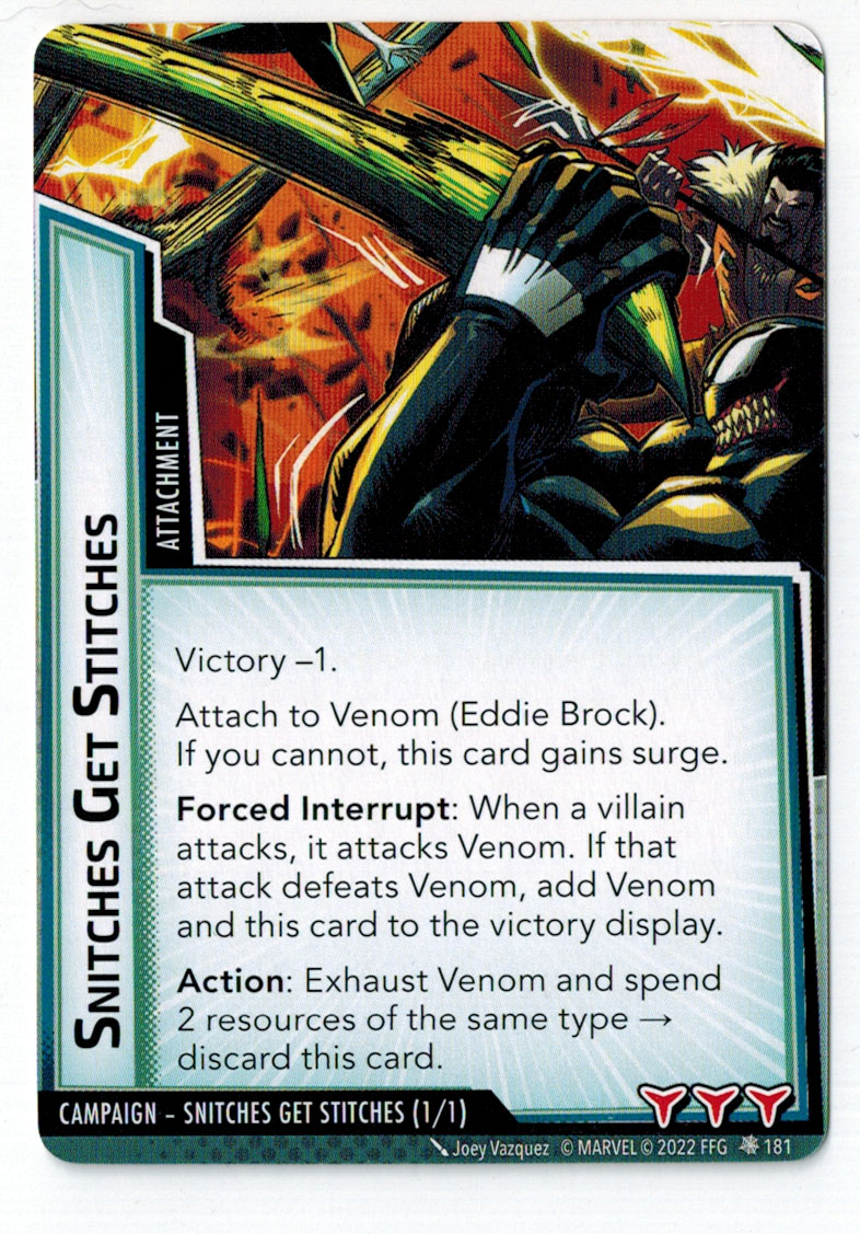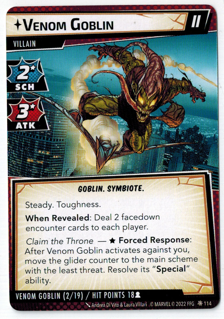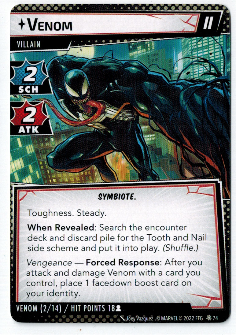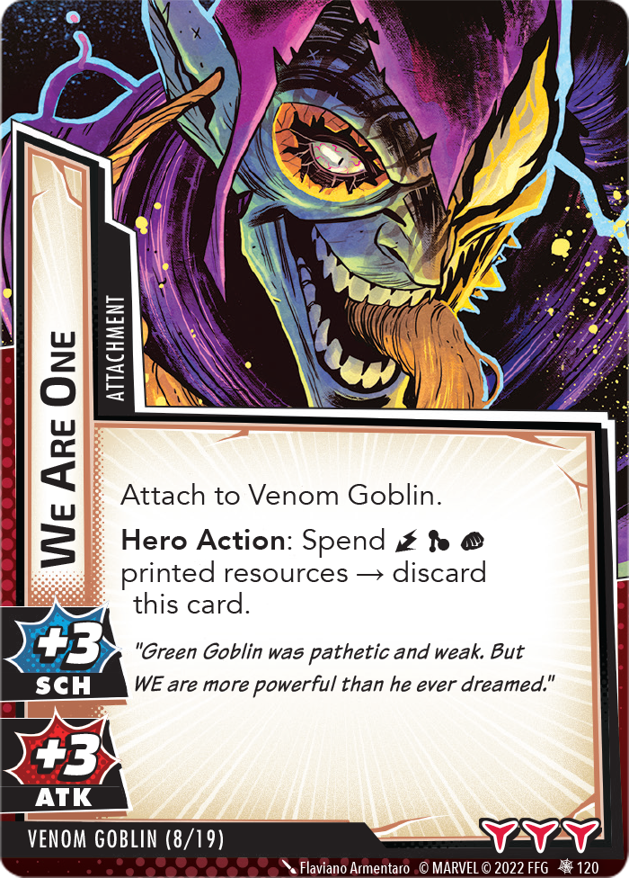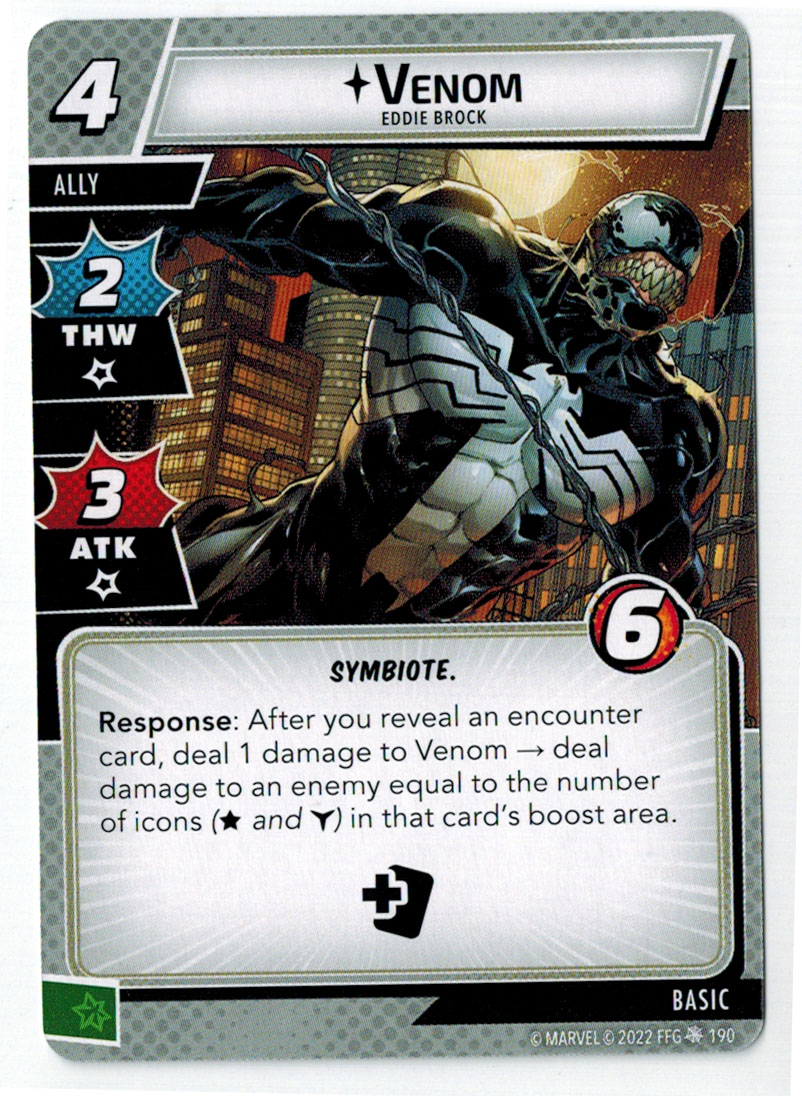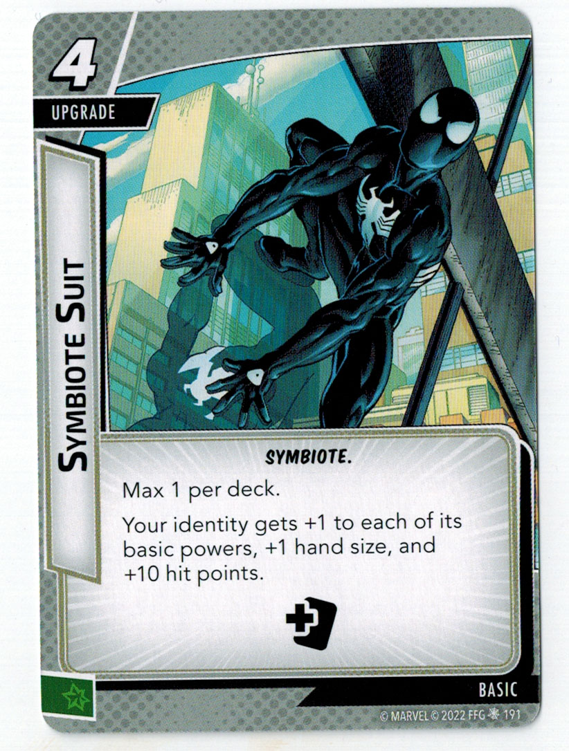 “The Symbiote Suit is just like the Venom ally, in that you can include it in any hero deck you want, unless you’re playing the Sinister Motives campaign, in which case you have to earn the ability to include it.” – FFG