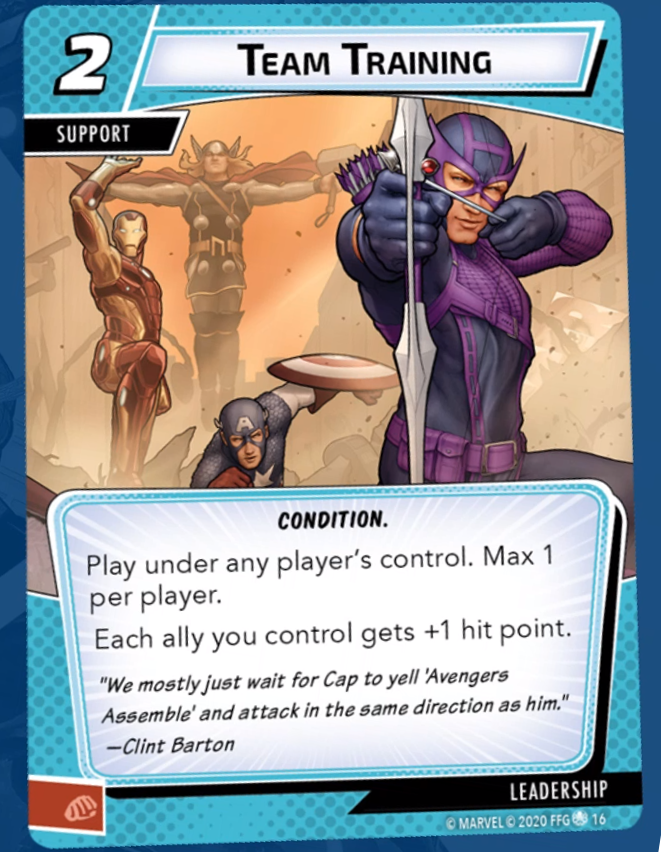 - Earth’s Mightiest Heroes: a 0-cost event that exhausts an Avengers character you control to ready another Avenger you control.