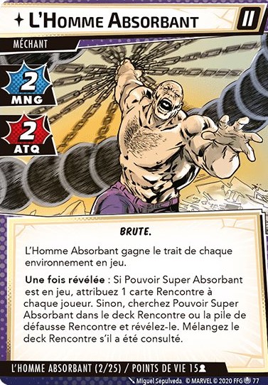 - Absorbing Man II: Absorbing Man gains the trait of each environment in play. When Revealed: If Super Absorbing is in play, deal each player an encounter card. Otherwise, search the encounter deck and discard pile for Super Absorbing and put it into play.