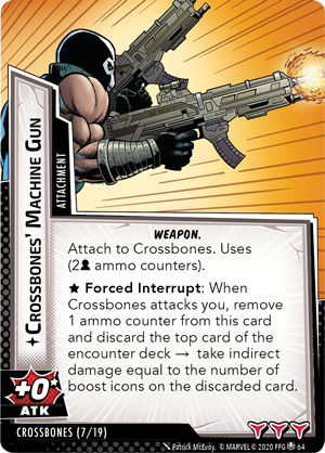 - Crossbones II: While Crossbones has a Weapon attachment, his attacks gain Piercing. When Revealed: Search the encounter deck and discard pile for Crossbones Machine Gun and attach it to Crossbones. Shuffle the encounter deck.