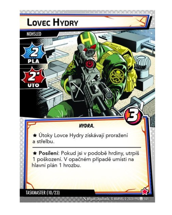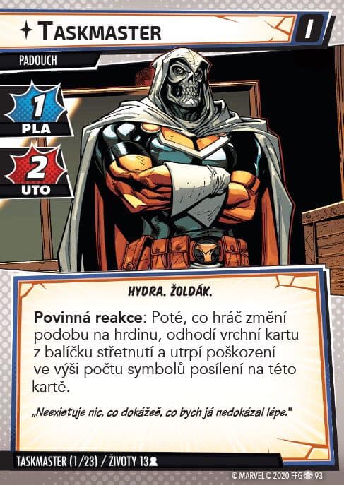 - Taskmaster forces players to discard the top card from the encounter deck and deal damage equal to the boost icons on the card after swapping to hero form.