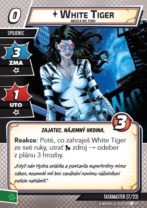 - White Tiger: Removes 3 threat from a scheme after spending a science resource after entering play (she seems to be a campaign-only card, as she is part of the “Taskmaster” set, but is also a player card).